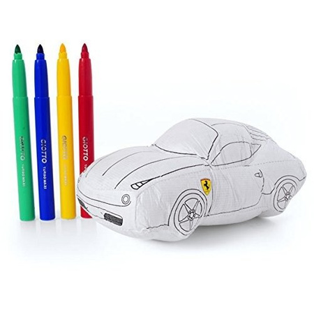 Description: Ferrari Colouring Car Set. Set comes with: Ferrari blank soft toy, 4 pens (red, yellow, blue, green), Double sided play mat (49cm x 42cm)